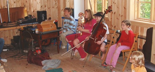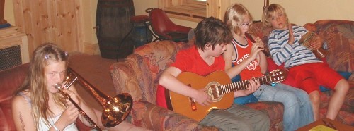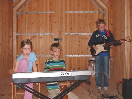 Søndagen gikk i hovedsak med til å forberede ettermiddagens avslutningskonsert for foreldrene. Vi hadde her laget et eget program i tillegg til fellesfremførelsen med Jon Halvor som dirigent. Som det fremgår av bildene over delte vi deltagerne inn i grupper på 3 eller 4 slik at hver gruppe i fellesskap skulle sette sammen en musikalsk sekvens som de syntes lød fint. Instrumentene valgte de selv. Vi stilte ingen andre krav til komposisjonen enn at den skulle involvere alle i gruppen.