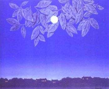 Dagens tema var ovenstående bilde av René Magritte. Bildet er i mørke blåtoner; det er natt. I horisonten ser vi konturer av hus og trær, på himmelen rett foran oss ser vi noen blader, og oppå bladene ser vi en lysende måne. Månen synes altså å være nærmere oss enn bladene. Alle fikk i oppgave å finne på et spørsmål til bildet, og lage en tegning.