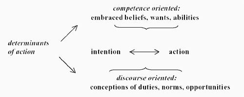 Modellen speglar två dimensioner. Å ena sidan, individens emotionella, kognitiva och fysiska tillstånd (competence oriented). Å andra sidan, individens föreställning om och tolkning av situationen (discourse oriented) (Halldén, 2001; Petersson & Jakobsson Öhrn 2003). En analys med utgångspunkt från denna modell, valideras inte genom att göra anspråk på att återge ”agentens egen syn på sitt agerande” (Halldén, 2001 s. 10). Den intention som uttolkaren/observatören tillskriver individen, blir trovärdig eller rimlig genom den argumentering som förs i beskrivningen av en viss handling och av graden av rationalitet i denna beskrivning (a.a.).