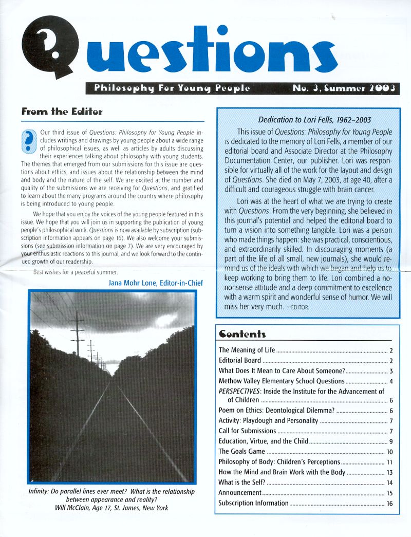Questions er et nytt amerikansk magasin viet filosofiske spørsmål – og svar – fra skoleelever og lærere. Hver utgave kretser rundt et enkelt tema og gjengir filosofiske samtaler mellom barn og ungdom i alderen 5-17 år, elevers egne filosofiske tekster, tegninger samt artikler som gir råd og tips om aktiviteter for foreldre og lærere som er interessert i å legge til rette for filosofiske samtaler med unge mennesker.