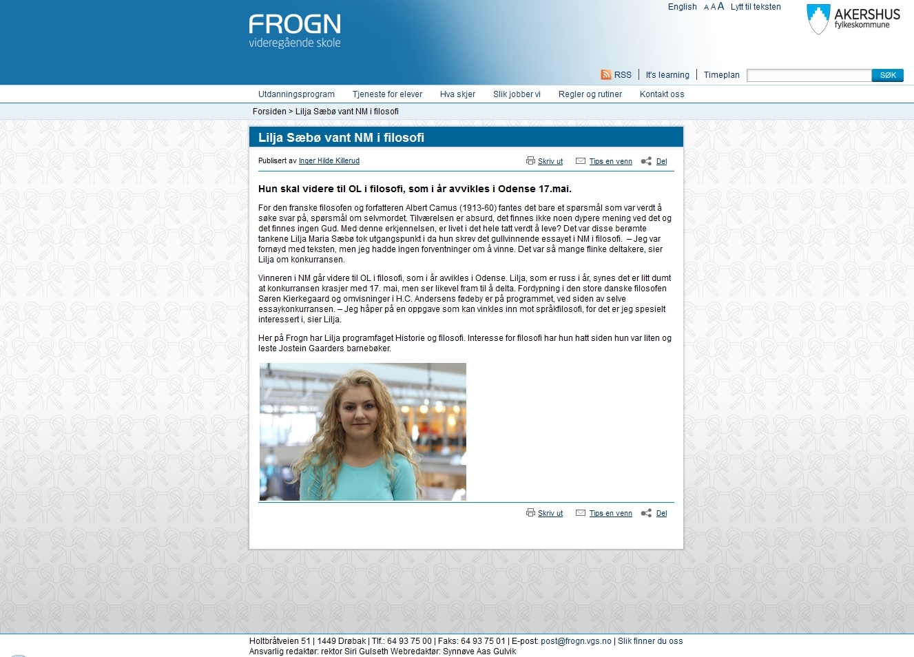 - Mediaomtale gullvinner: frogn.vgs.no (faksimile)