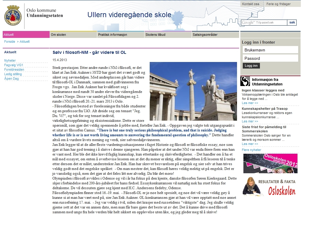 - Mediaomtale gullvinner: ullern.vgs.no (faksimile)